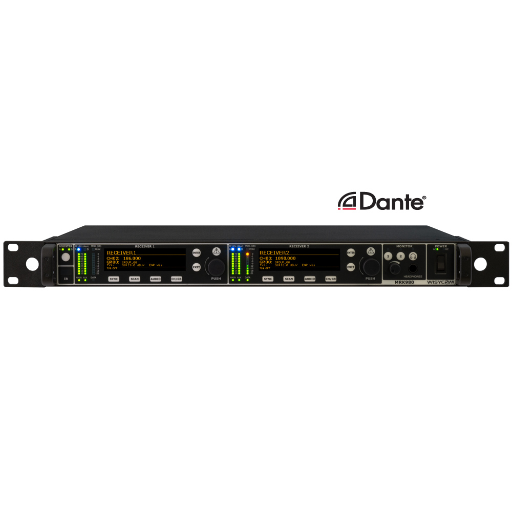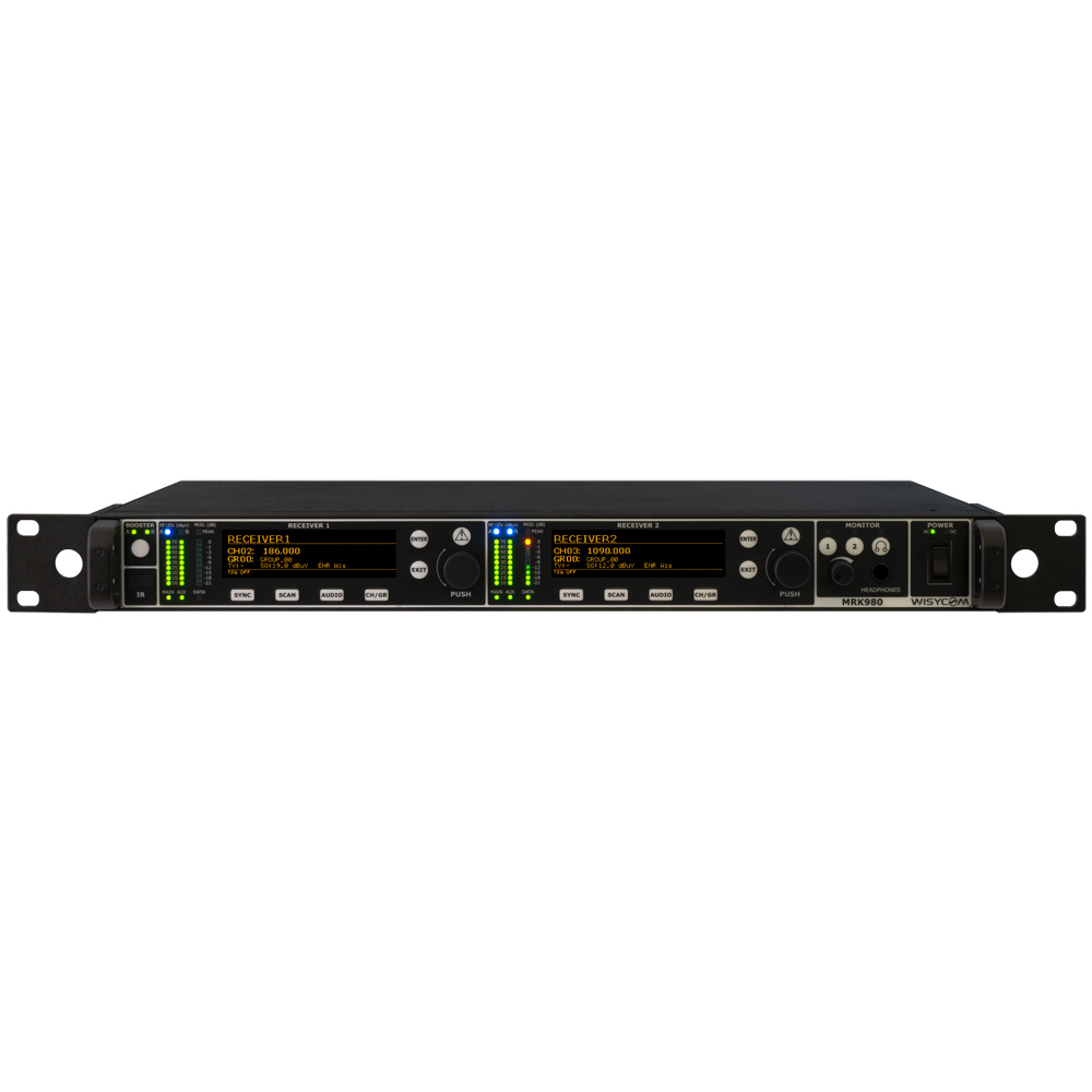 Wisycom MRK980 is a true diversity, ultra-wideband dual channel receiver. With its 1090MHz of band switching, it ensures the users an exceptional band flexibility, combined with a superb selectivity and intermodulation immunity, for best operating performances of the wireless microphone systems. MRK980 also features an internal DSP processor, Wisycom famous Multicompanding system, new Dante compatibility and a completely and renewed user interface, which make this system easy and quick to setup.